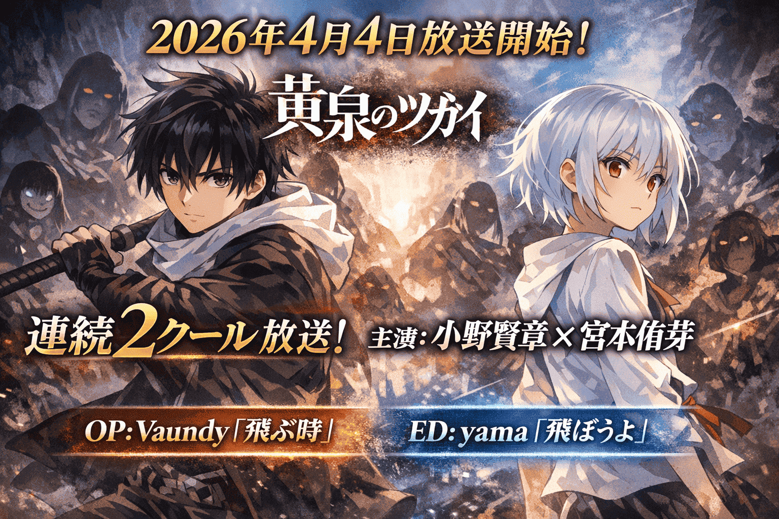 『黄泉のツガイ』は2026年4月4日(土)23:30放送開始、しかも連続2クールです。ファンがいちばん安心できる土台は、すでに見えています。
