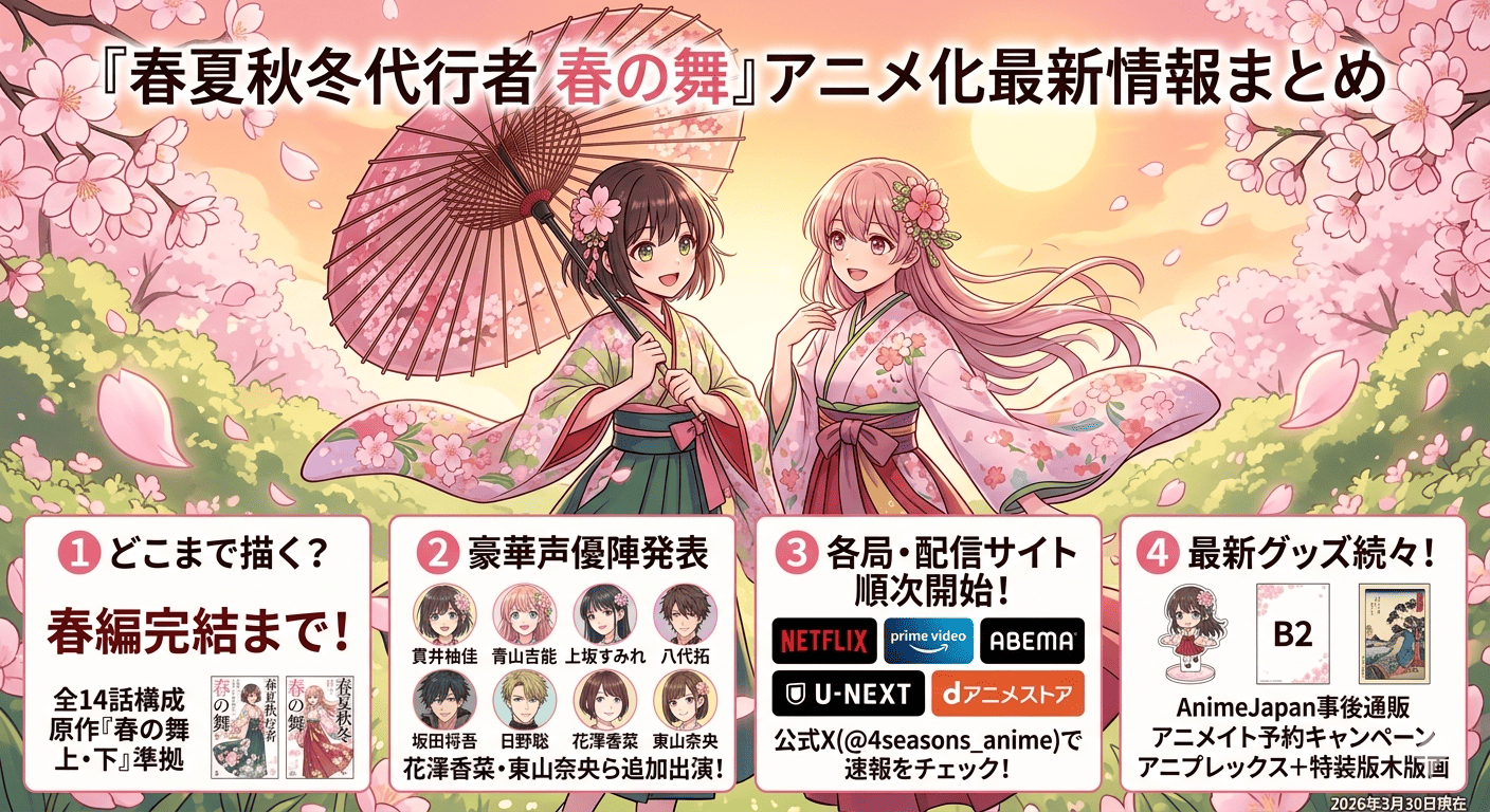 いま知りたい情報を一言でまとめるなら、「春の舞」はかなり高い確度で最後まで描かれそうで、追うなら今がちょうどいいという状況です。放送が始まったばかりで、配信も広く、グッズ展開も一気に動いています。作品そのものに興味がある人にも、まず情報だけ押さえたい人にも、今は最も入りやすいタイミングです。