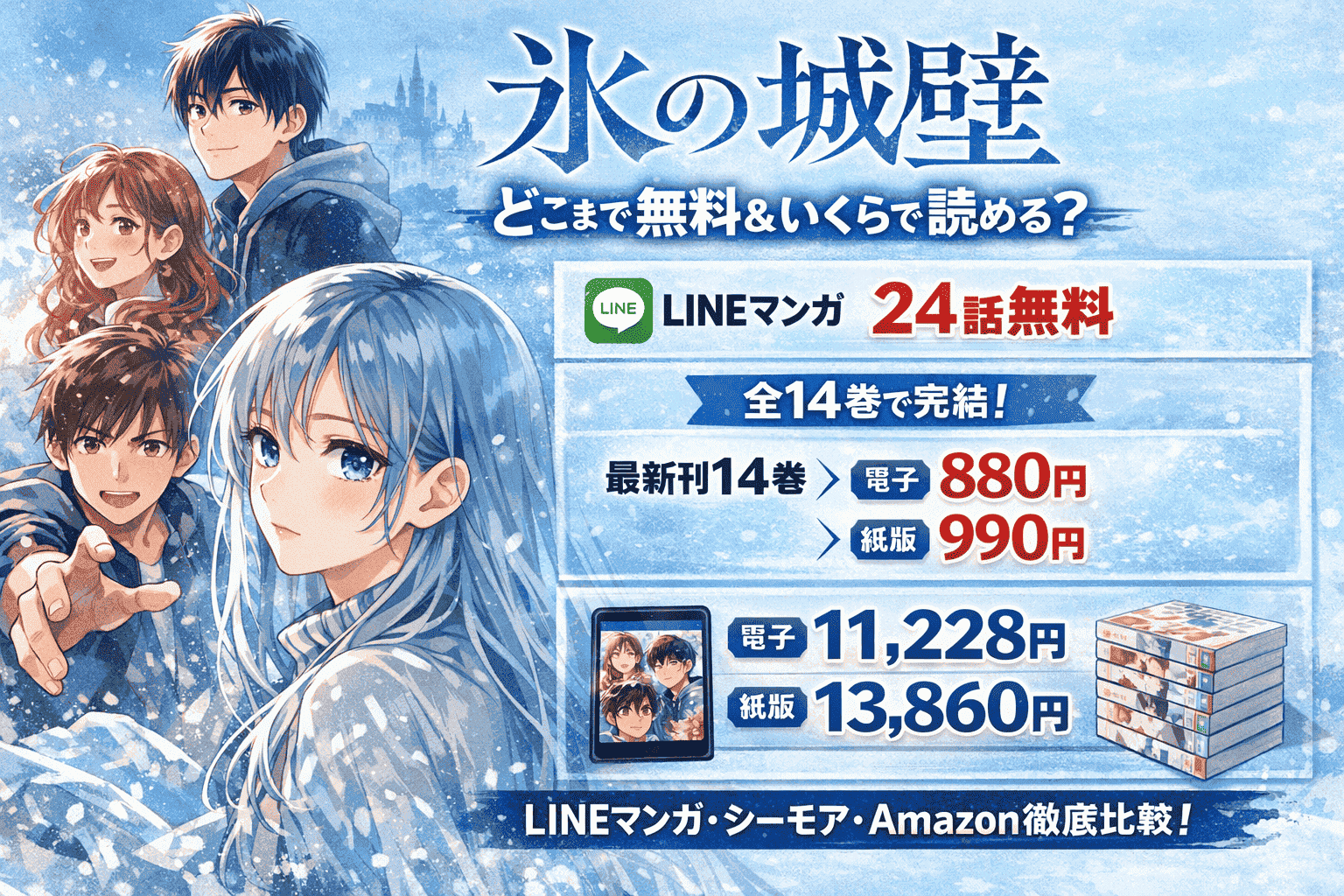 『氷の城壁』はLINEマンガで24話無料、単行本は全14巻で完結、最新刊14巻は電子880円・紙版990円です。電子フルカラー版を通常価格でそろえると11,228円、紙版は13,860円になります。