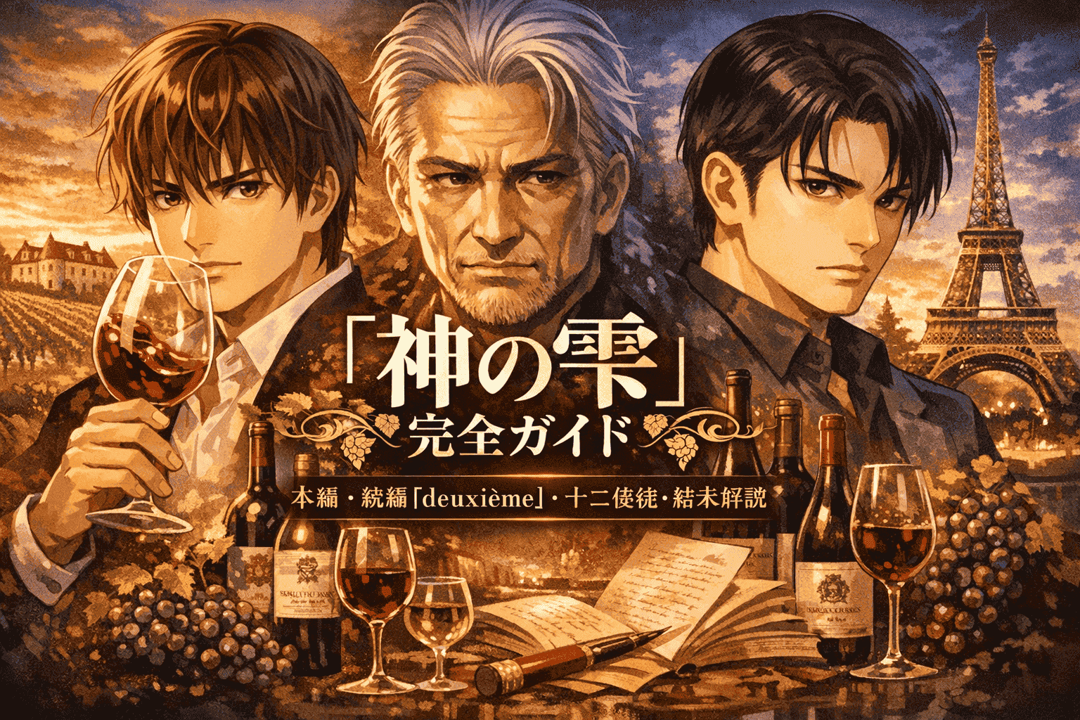 本記事は、講談社公式作品ページ、モーニング公式、コミックDAYS、マガポケ、TVアニメ公式サイト、Apple TV Press、Hulu公式、およびワイン系資料をもとに構成しています。巻数やシリーズの区切りについては、本編『神の雫』が全44巻、続く『マリアージュ~神の雫 最終章~』が全26巻、『神の雫 deuxième』が全2巻完結の後日譚であることを基準に整理しました。なお、十二使徒の一覧は、公式にまとまったリストが見当たらないため、ワイン系資料を複数照合したうえで掲載しています。