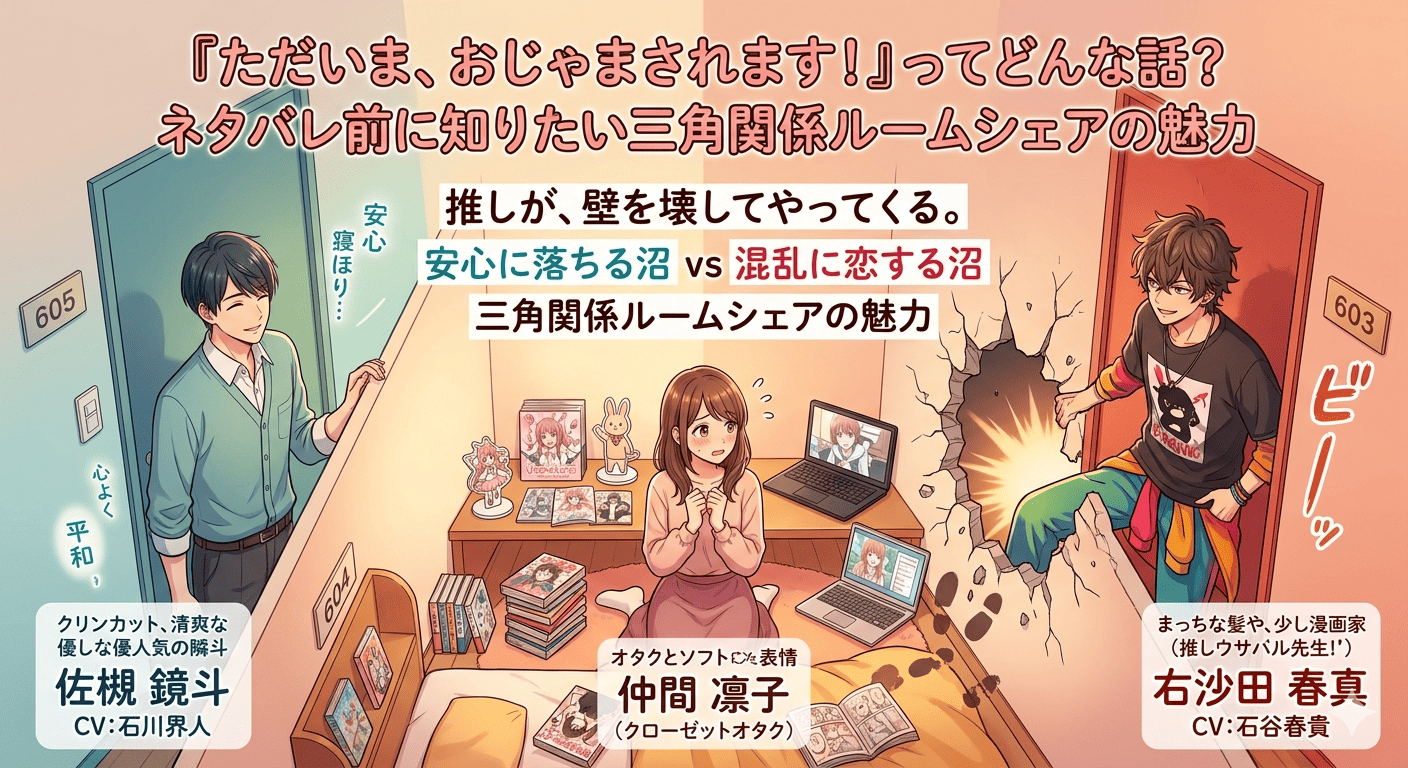 『ただいま、おじゃまされます!』は、24歳の隠れオタクOL・仲間凛子が、左隣の爽やか紳士・佐槻鏡斗、右隣の人気漫画家・右沙田春真に挟まれながら、近すぎる三角関係ルームシェアへ巻き込まれていくラブコメです。