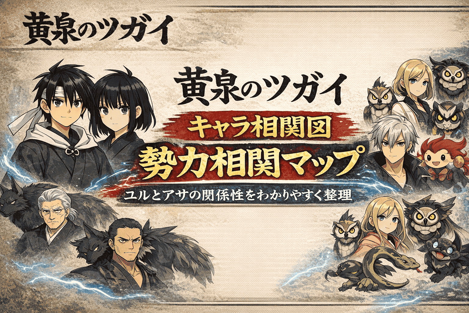 この記事では、『黄泉のツガイ』のキャラ相関図をベースにしながら、勢力相関マップとしても全体像を整理していきます。ユルとアサを中心に、東村勢力・下界勢力・影森家・追跡・協力・主従関係まで、初見でもわかりやすくひもといていきます。