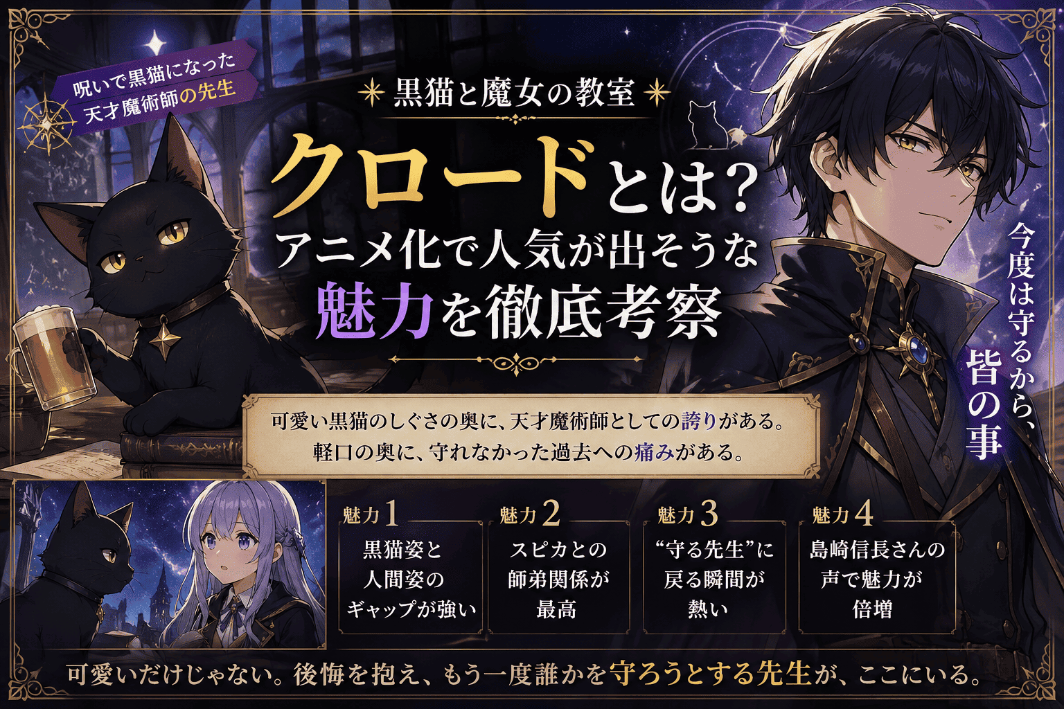 最大の魅力は、可愛い黒猫でありながら、後悔を抱えてもう一度誰かを守ろうとする先生である点です。